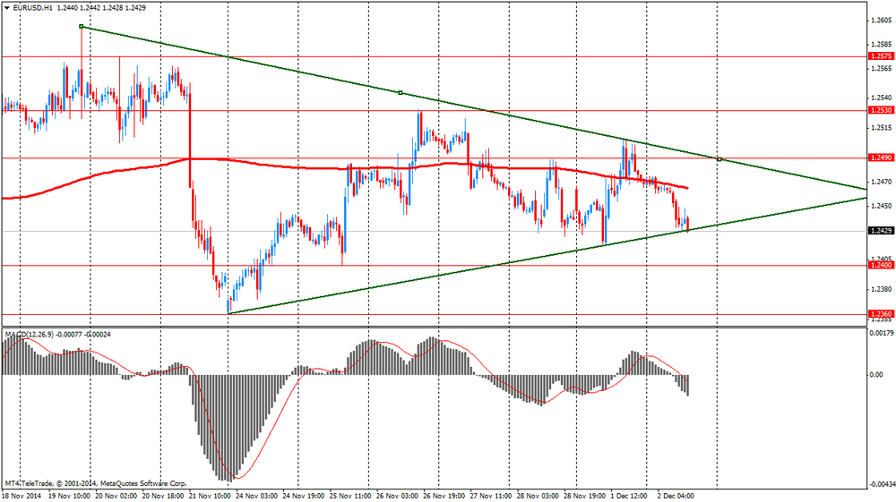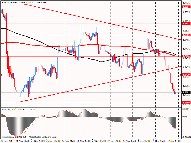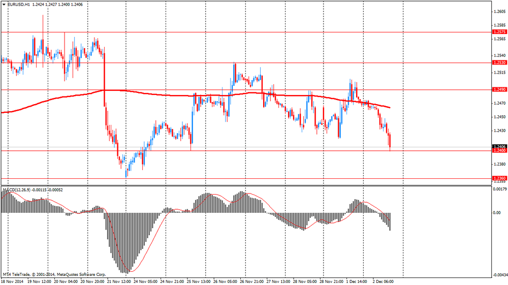 Доллар США торгуется в узком диапазоне после отступления вчера от пятилетнего максимума по отношению к евро, так как слабость доллара перевесила пессимистичные показатели европейского PMI. Окончательные данные исследовательской организации Markit Economics показали: индекс PMI для промышленного сектора еврозоны в ноябре опустился до отметки 50,1 пункта, которая является минимальной с июня 2013 года, с 50,6 пункта в октябре. Также инвесторы в ожидании публикации данных по числу занятых в США, которые выйдут завтра. Предварительный прогноз показывает, что рост числа занятых замедлился.