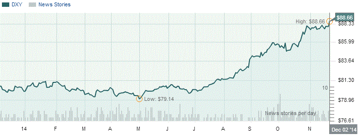 Индекс доллара (DXY), показатель силы доллара США против корзины из шести валют, вырос на 0,78% - до 88,66, т.е. самого высокого уровня с марта 2009 года.