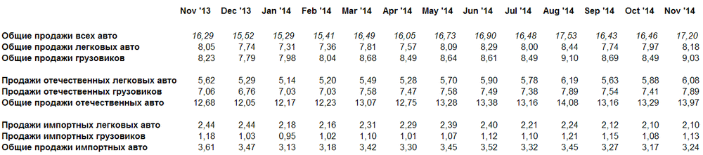 Данные, представленные Autodata Corp., показали, что по итогам прошлого месяца общий объем продаж автомобилей вырос до уровня 17,2 млн. единиц по сравнению с 16,5 млн. единиц в октябре.