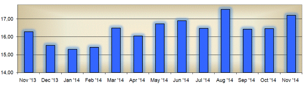 В отчете говорилось, что суб-индекс промышленного производства вырос в двадцать пятый раз подряд в ноябре, но темпы роста замедлились до самого низкого уровня с августа 2013 года.