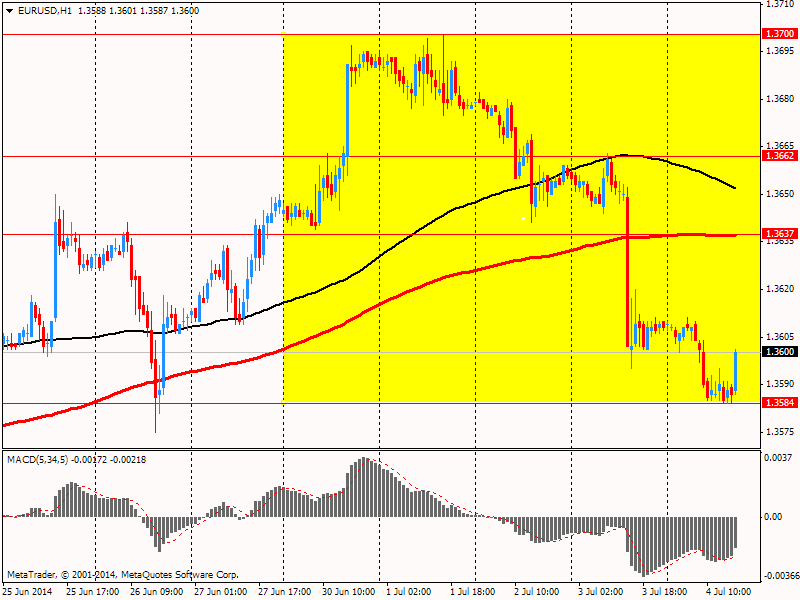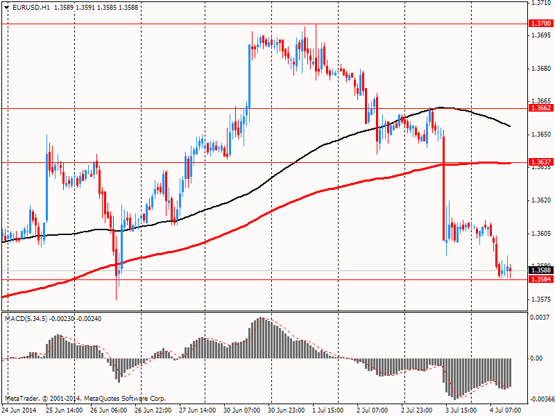Евро упал к $1.3590, обновив сессионный минимум после выхода негативных данных по объему производственных заказов Германии. Показатель в мае 2014 года снизился на 1,7% по сравнению с предыдущим месяцем. Аналитики в среднем прогнозировали сокращение показателя на 0,8%. Таким образом, данные не оправдали оценок экспертов, указав на слабость реального сектора экономики крупнейшей экономики Европы.