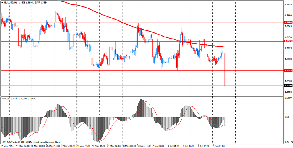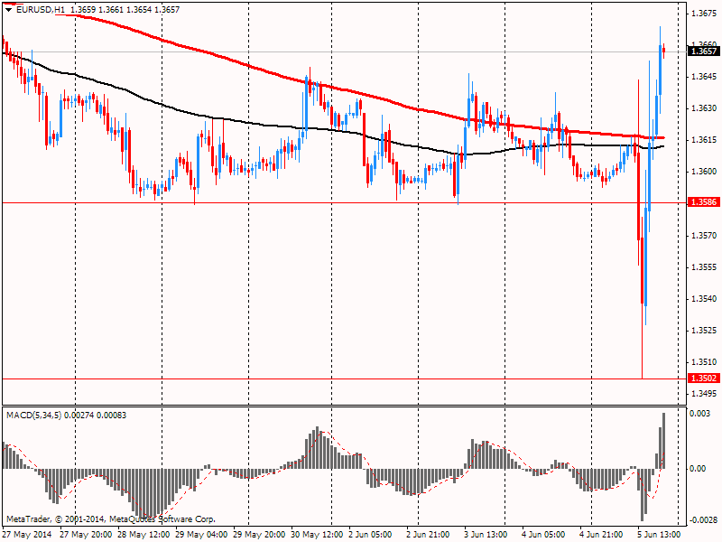 Евро резко вырос против доллара, вернув при этом все ранее утраченные позиции, что было связано с закрытием коротких позиций. Эксперты отмечают: первой реакцией на заявление ЕЦБ стало быстрое и резкое снижение пары к области $1.3500, после чего она уверенно восстановилась и сейчас торгуется на предыдущих уровнях, отметив дневной максимум на $1.3669. Напомним, ЕЦБ объявил о снижении всех основных ставок с 11 июня. Базовая ставка снижена с 0,25% до 0,15% годовых, кредитования — с 0,75% до 0,4% годовых. Кроме того, регулятор ввел отрицательную депозитную ставку — на уровне -0,1%.