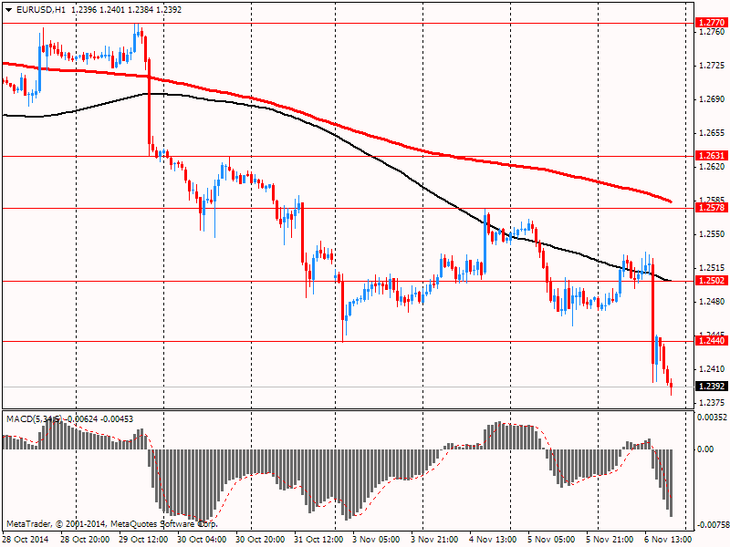Доллар укрепился против европейской валюты, достигнув при этом максимального значения с 21 августа 2012 года. Давление на евро оказали слова главы ЕЦБ Драги. После решения ЕЦБ оставить ставки на рекордных минимумах Драги заявил, что высокая безработица продолжает препятствовать экономическому восстановлению региона, а геополитическое напряжение может негативно отразиться на ситуации с инвестированием. В связи с этим Управляющий Совет будет пристально следить за развитием событий и при необходимости действовать. Если перспективы ценовой стабильности или инфляционные ожидания ухудшатся, Банк вполне может запустить новые меры. Представители Совета уже разрабатывают возможные шаги на такой случай. Между тем, запланированные покупки ABS начнутся уже совсем скоро, и в совокупности с программой TLTRO окажут заметное влияние на баланс Банка, который, по плану, должен вернуться на уровень начала 2012. Кроме того, внутренний спрос в еврозоне поддержат структурные реформы и снижение цен на электроэнергию. Мировое восстановление благотворно действует на экспорт. Однако импульс роста в регионе по-прежнему слаб, а уровень инфляции останется низким ещё какое-то время и начнёт повышаться не раньше 2015 года. Тем не менее, Драги заверил, что запущенные меры должны помочь приблизить ИПЦ к целевому значению. Также глава ЕЦБ отметил, что решения, озвученные сегодня, были приняты единогласно, развеяв при этом слухи о том, что многие политики выступают против него.