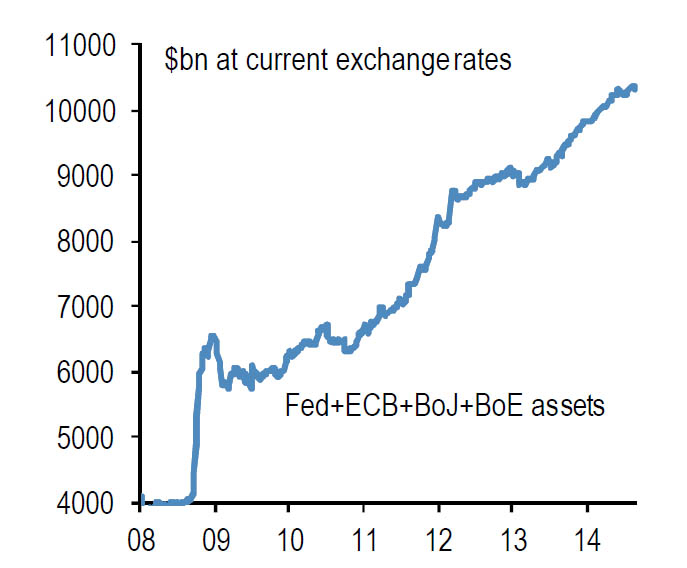 Ресурс Zero Hedge приводит комментарии стратега JP Morgan Николауса Панигирцоглоу (Nikolaos Panigirtzoglou), отмечающего, что "текущий эпизод роста избыточной ликвидности, начавшийся в мае 2012 года, кажется, был самым экстремальным в абсолютном выражении и меры ЕЦБ могут сделать его еще более экстремальным". Комментарий дополняется интересным графиком, демонстрирующим рост активов основных центробанков мира и указывающим, по мнению автора, на зависимость глобальной экономики от вливания ликвидности, позволяющего игнорировать прочие факторы.