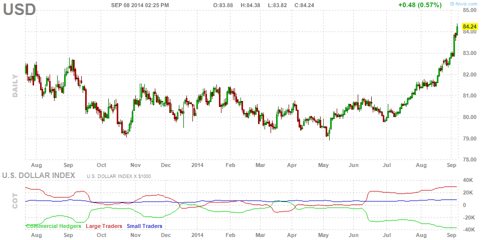В течение американской сессии на рынке Форекс наблюдалось укрепление курса доллара США против основных валют. Индекс доллара показал максимум в области 84,40 пунктов, укрепившись в течении сегодняшней сессии на 0,7%. Индекс повышается третий месяц подряд под влиянием скорого завершения ФРС программы QE и ожиданий более раннего начала процесса нормализации денежно-кредитной политики федрезерва.