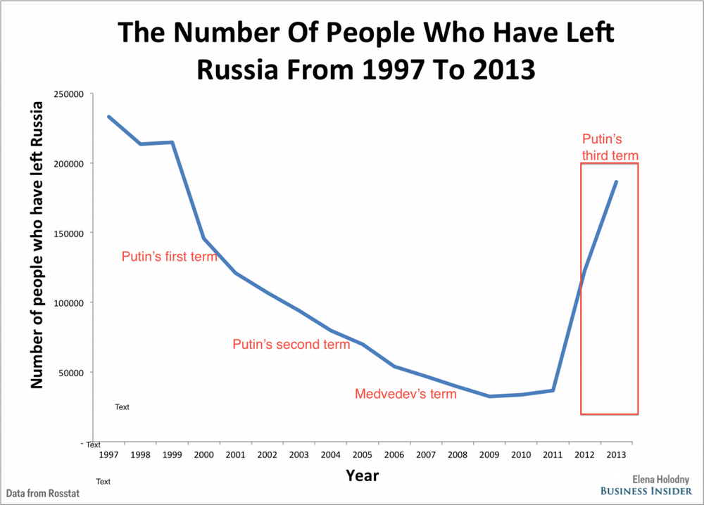 Россия переживает очередную крупную утечку мозгов. И хотя эмиграция снизилась с 1997 по 2011 годы по данным Росстата, на третий президентский срок Владимира Путина пришелся неожиданный рост количества людей, покидающих страну.