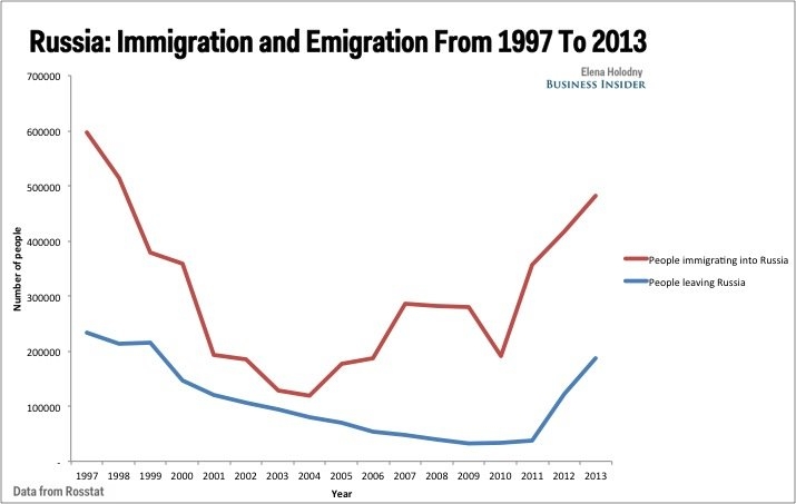 По данным ООН, Россия переживает второе по величине увеличение числа международных мигрантов в 2013 году. Число людей, приехавших в Россию, на самом деле превышает число людей уехавших из нее.