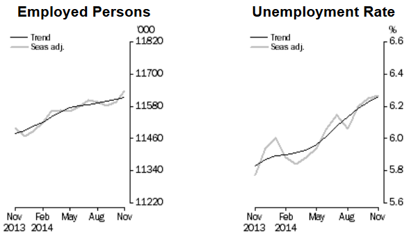 Уровень безработицы в Австралии в ноябре совпал с прогнозом и составил 6,3%. Число рабочих мест в Австралии в ноябре выросло до +42,7 тыс, прогноз экономистов оказался ниже +15 тыс. Уровень безработицы - индикатор, публикуемый Австралийским бюро статистики, показывает процент безработного населения по отношению ко всему трудоспособному населению страны. Высокий уровень безработицы влияет на снижение средней заработной платы и затрат потребителей. Поскольку затраты потребителей являются основной частью всех расходов, увеличение безработицы часто ведет к замедлению экономического роста. Также стоит сказать о том, что высокий уровень безработицы или его рост может стать причиной снижения ставок центральным банком с целью улучшить ситуацию на рынке труда.