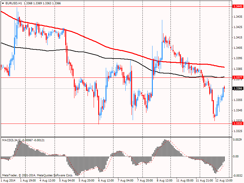 Евро отступил от сессионного минимума против доллара, но продолжает торговаться с понижением. На динамику торгов повлияли данные по настроениям в деловой среде от института ZEW. Индикатор экономических настроений от ZEW в Германии значительно снизился в августе 2014 года: соответствующий индикатор потерял 18,5 очков и в настоящее время составляет 8,6 пункта (долгосрочное среднее 24,6 пункта). Показав уменьшение восьмой раз подряд, индикатор достиг самого низкого уровня с декабря 2012 года, причем текущее снижение является самым сильным с июня 2012 года. Снижение экономических настроений, скорее всего, связано с текущей геополитической напряженностью, которая повлияла на немецкую экономику в настоящее время. В частности, текущие цифры по промышленному производству и поступающим заказам свидетельствуют о заметном снижении инвестиционной деятельности со стороны немецких фирм на фоне неопределенных перспектив продаж. Поскольку экономика в еврозоне не набирает обороты, есть признаки того, что экономический рост в Германии будет в 2014 году слабее, нежели ожидалось. Оценка текущей экономической ситуации в Германии снизилась. Соответствующий индикатор потерял 17,5 очков и составил 44,3 пунктов. Индикатор экономических настроений от ZEW для еврозоны также значительно снизился в августе. Индикатор потерял 24,4 пункта по сравнению с предыдущим месяцем, и в настоящее время составляет 23,7 пунктов. Индикатор текущей экономической ситуации в еврозоне снизился на 2,3 пункта до -33,8.