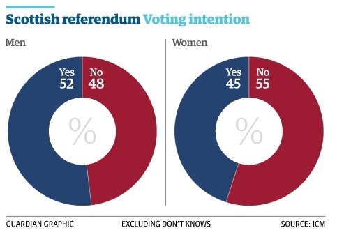 Также исследование показало, что среди мужчин больше сторонников независимости (52%), в то же время большинство опрошенных женщин будут голосовать против (55%).