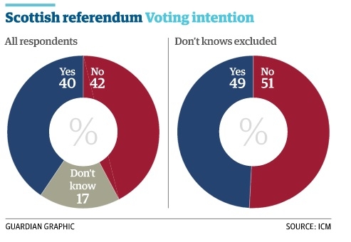 Согласно последнему опросу в Шотландии, опубликованному ICM Guardian, 51% респондентов высказались «за» провозглашение независимости, тогда как «против» проголосовало 49% граждан.