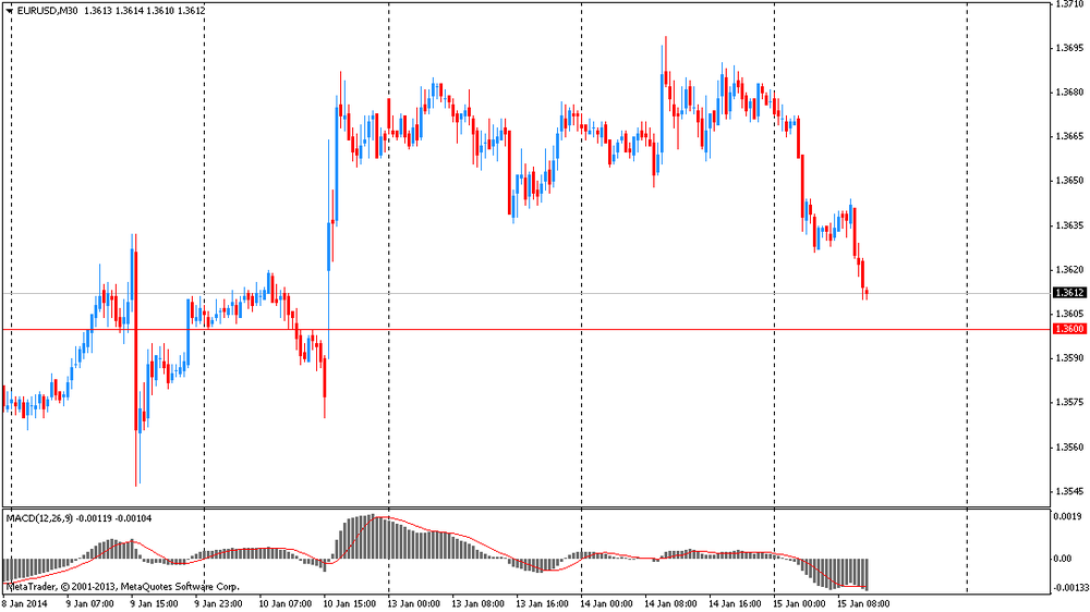 Курс евро упал против доллара, что было связано с выходом данных по Германии и пересмотром прогнозов по глобальному росту со стороны Всемирного банка. Отчет по Германии показал, что рост ВВП замедлился в 2013 году на фоне неопределенности, вытекающей из кризиса еврозоны. Валовой внутренний продукт Германии с коррекцией на инфляцию увеличился на 0,4% в 2013 году после роста на 0,7% в предыдущем году. Потребление домашних хозяйств в крупнейшей экономике еврозоны в 2013 году увеличилось на 0,9%, в то время как государственное потребление поднялось на 1,1%. Рост экспорта составил 0,6% в 2013 году, по сравнению с 3,2% в предыдущем году.