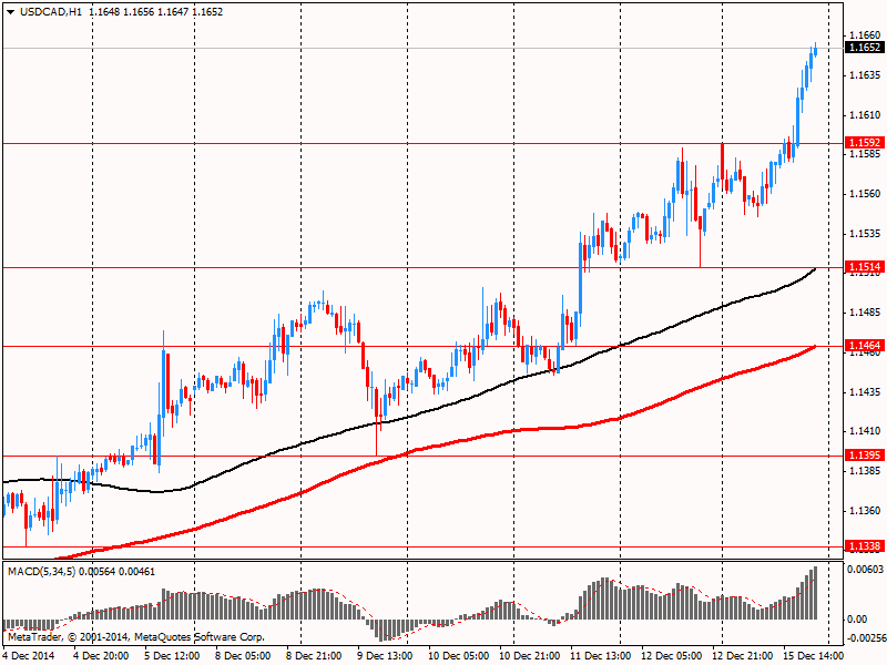 Канадский доллар существенно снизился против американской валюты, достигнув при этом нового пятилетнего минимума, что было связано с публикацией неоднозначных отчетов по США и ожиданием результатов заседания ФРС. Ранее представленные данные показали, что промышленное производство в США выросло с учетом сезонных колебаний на 1,3% в ноябре. Это самый большой рост с мая 2010 года. Экономисты ожидали рост на 0,8%. Другим признаком усиления стала небольшая корректировка в сторону увеличения данных по промпроизводству в течение последних трех месяцев. Коэффициент использования производственных мощностей вырос до 80,1% против прогнозов на уровне 79,4%. Последнее значение оказалось наибольшим с марта 2008 года.