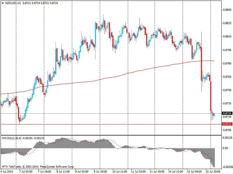 Новозеландский доллар упал до недельного минимума и продолжил снижение после выхода данных по индексу потребительских цен в стране. Так, уровень инфляции в Новой Зеландии вырос на +1,6% во втором квартале по сравнению с годом ранее, а за квартал составил +0,3% - это меньше чем прогноз экономистов (+0,5%). Такое отклонение от прогноза оказало сильное влияние на динамику Новозеландской валюты. Напомним, Резервный банк Новой Зеландии поднял базовую процентную ставку в этом году на 75 пунктов - это составило 3,25%. Такой показатель является самым высоким среди основных развитых стран.