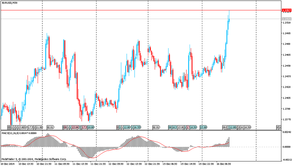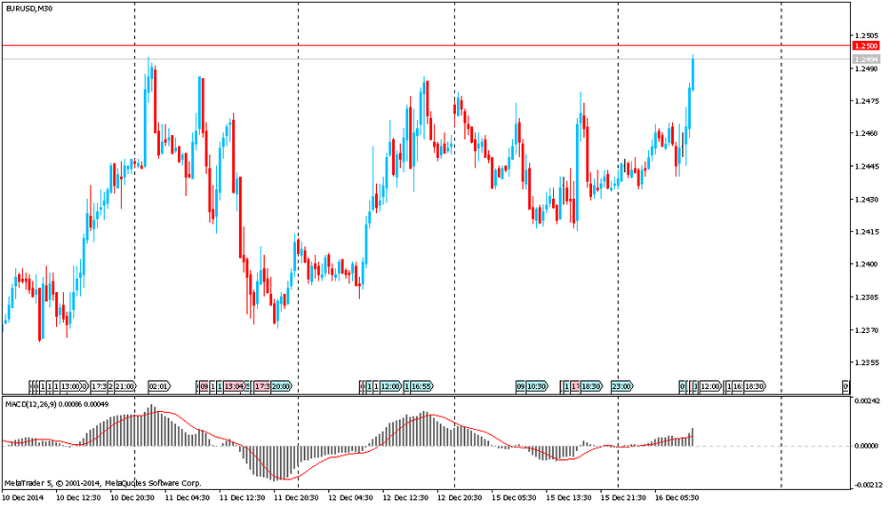 Наиболее ожидаемым событием дня будет оглашение решения ФРС по ставкам (в 19:00 GMT), и последующая пресс-конференция ФРС (в 19:30 GMT). Участники рынка также будут следить за сопроводительным заявлением и экономическими прогнозами Комитета по открытым рынкам ФРС (в 19:00 GMT). Эксперты отмечают, что ФРС может убрать выражение «продолжительный период» и заменить его фразой о медленном повышении ставок, но это будет зависеть от поступающих данных. Впрочем, не дотягивающая до целевого уровня инфляция в США может вынудить власти остаться верными формулировке "продолжительный период". С учетом последних показателей по занятости в США рынки рассчитывают на повышение прогнозов ЦБ по ВВП на 2015 и 2016 гг., а также на снижение прогнозов по инфляции и безработице.