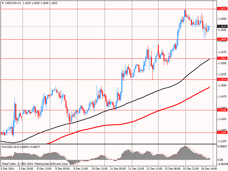Канадский доллар существенно снизился против американской валюты, достигнув при этом нового пятилетнего минимума, что было связано с публикацией неоднозначных отчетов по США и ожиданием результатов заседания ФРС. Ранее представленные данные показали, что промышленное производство в США выросло с учетом сезонных колебаний на 1,3% в ноябре. Это самый большой рост с мая 2010 года. Экономисты ожидали рост на 0,8%. Другим признаком усиления стала небольшая корректировка в сторону увеличения данных по промпроизводству в течение последних трех месяцев. Коэффициент использования производственных мощностей вырос до 80,1% против прогнозов на уровне 79,4%. Последнее значение оказалось наибольшим с марта 2008 года.