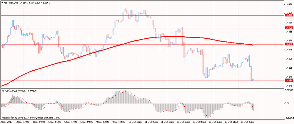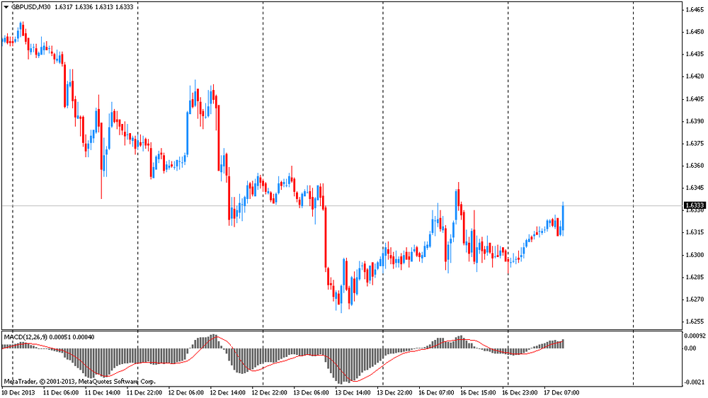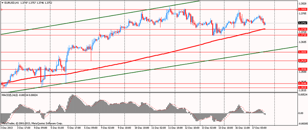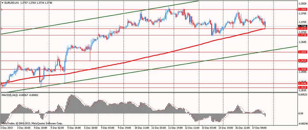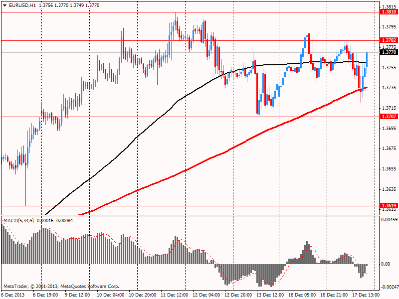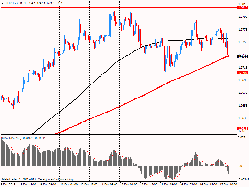 Курс евро заметно вырос против доллара, почти достигнув сессионного максимума, так как внимание участников рынка все больше и больше переключается на оглашение итогов заседания ФРС. Добавим также, что это будет последние заседание для главы ФРС Бернанке в этой должности - в следующем месяце он передаст свои полномочия Джанет Йеллен. Рынки ожидают, что ФРС может принять решение о небольшом понижении ежемесячной программы по покупке активов, которая на данный момент составляет 85 миллиардов долларов в месяц. Тем не менее, вероятность данного шага не высока, не смотря на представленные ранее данные, которые оказались лучше прогнозов. Скорее всего, решение о понижении объема данной программы будет принято уже в следующем году. Отметим, что 34% экспертов, опрошенных Bloomberg, считают, что Федрезерв начнет свертывание программы количественного стимулирования (QE) на декабрьском заседании. Более 46% аналитиков, опрошенных газетой The Wall Street Journal, ожидает, что Федрезерв объявит о сокращении ежемесячных объемов выкупа облигаций, составляющих в настоящее время $85 млрд, до конца января 2014 года, поскольку перспективы американской экономики улучшаются. При этом лишь 25% опрошенных ожидают уменьшения Центробанком объемов количественного стимулирования (QE) на декабрьском заседании.