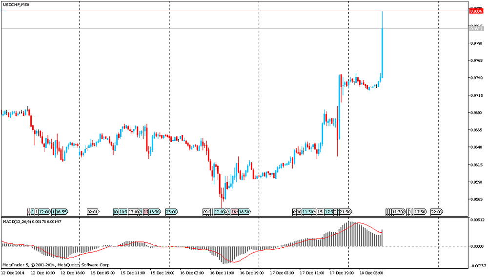 Франк резко упал, взвинтив пару USD/CHF к уровню $0.9836 после того, как Швейцарский национальный банк объявил о внедрении негативных процентных ставок. Стало известно, что ЦБ Швейцарии введет ставку по депозитам до востребования в размере -0,25%. Помимо этого, регулятор расширил целевой диапазон для трехмесячной ставки Libor до -0,75%-0.25%. Все эти заявления оказали сильное давление на курс франка.