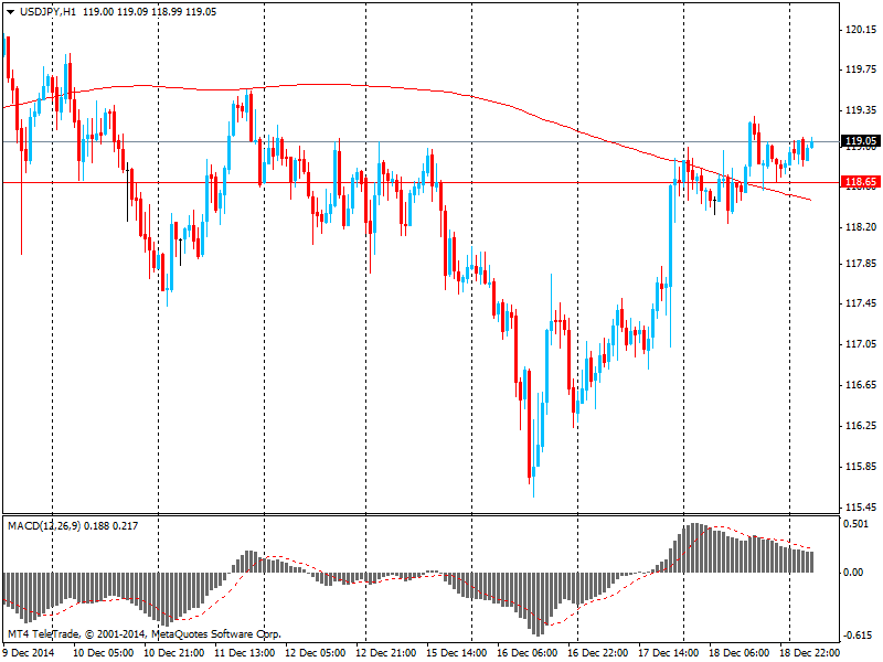 Пара USD/JPY, вероятно, будет торговаться около Y119 до конца сегодняшней азиатской сессии, так как инвесторы воздерживаются от открытия крупных позиций перед праздниками, говорят в Mizuho Securities. "Рынку не хватает импульса", - отмечают в банке. Инвесторы - в ожидании выступления управляющего Банка Японии Харухико Куроды на пресс-конференции и его заявлений относительно слабой инфляции на фоне падения цен на нефть. Однако какие-то серьезные неожиданности маловероятны. Пара сейчас торгуется по Y119,05. Восходящий тренд пары подтвердится, если она продолжит торговаться выше линии Y118,65.