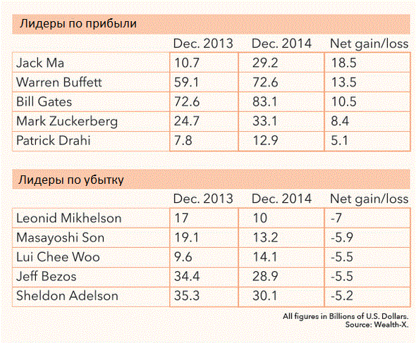 Обратите внимание на топ-5 "победителей" и "проигравших" в 2014 году. Все цифры приведены в миллиардах долларах США.