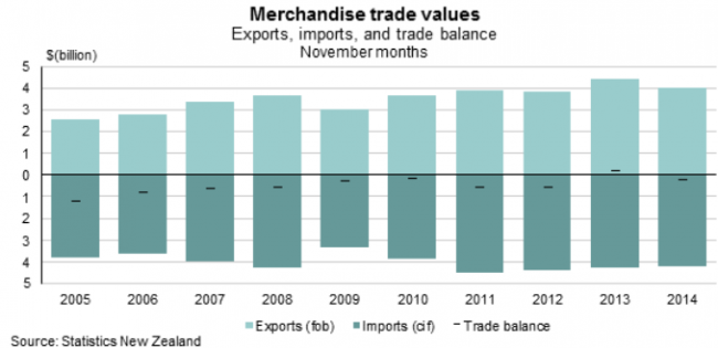 Дефицит внешней торговли товарами Новой Зеландии в ноябре -NZ$213 млн, что выше ожиданий -NZ$550 млн. Это минимальный размер дефицита с ноября 2010 года. Торговый баланс, публикуемый Бюро статистики Новой Зеландии, отражает соотношение между объемами экспорта и импорта за 1-летний период. Положительное значение баланса означает, что экспорт превышает импорт, и наоборот. Дефицит торгового баланса указывает на низкую конкурентоспособность эконокими страны.
