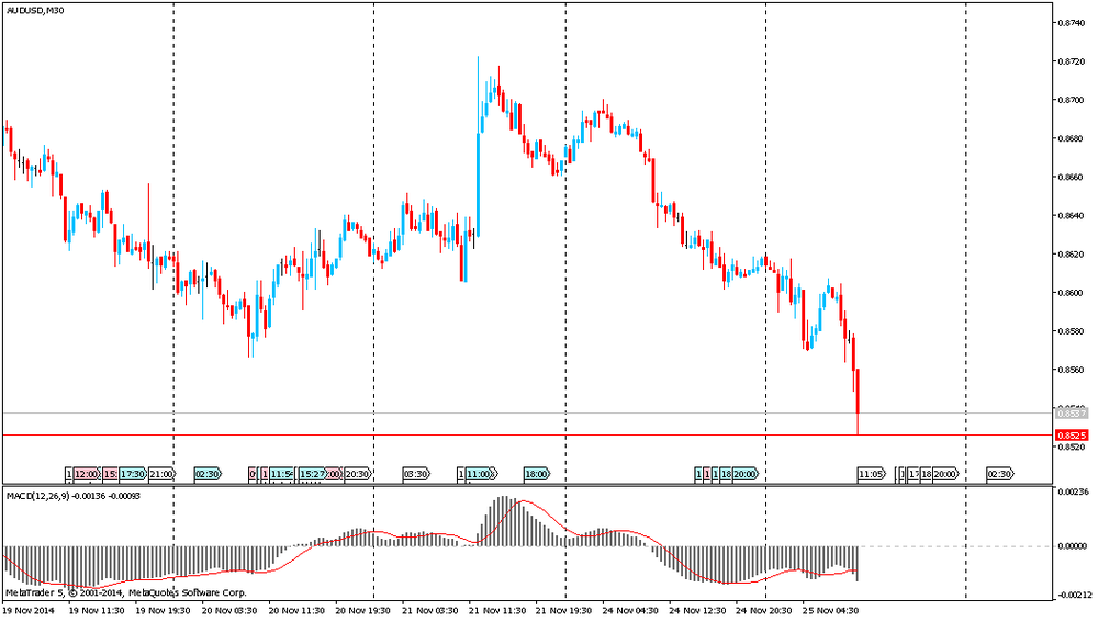 Участники рынка отслеживают данные США по индексу потребительских настроений от Reuters/Michigan (14:55 GMT). Данный индекс представляет собой результаты опроса потребителей на предмет уверенности в текущей экономической ситуации. В опросе участвует около 500 респондентов. С помощью данного отчета выясняется желание потребителей тратить свои деньги. Индекс является опережающим индикатором потребительского настроения. Показатель рассчитывается путем добавления к 100 разницы между числом оптимистов и пессимистов, выраженным в процентах. Ожидается, что показатель в ноябре составит 90,2 против 89,4 в предыдущем месяце.