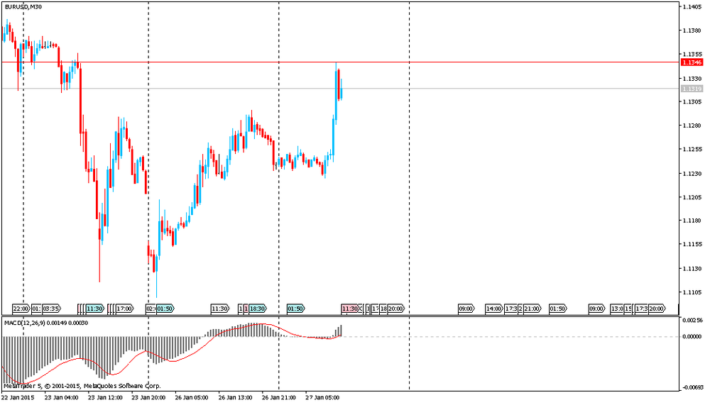 Евро вырос, так как комментарии зам. главы ШНБ Дантина о том, что ЦБ готов провести интервенцию, стимулировали пару евро/доллар США, которая достигла нового дневного максимума $1.1345. У Швейцарского национального банка не было других вариантов, кроме как отказаться от нижнего предела для пары евро/швейцарский франк, который он защищал в течение 3,5 лет, так как единая европейская валюта больше не является подходящим ориентиром для франка. Об этом заявил вице-президент Швейцарского национального банка Жан-Пьер Дантин в интервью изданию TagesAnzeiger, опубликованном во вторник.