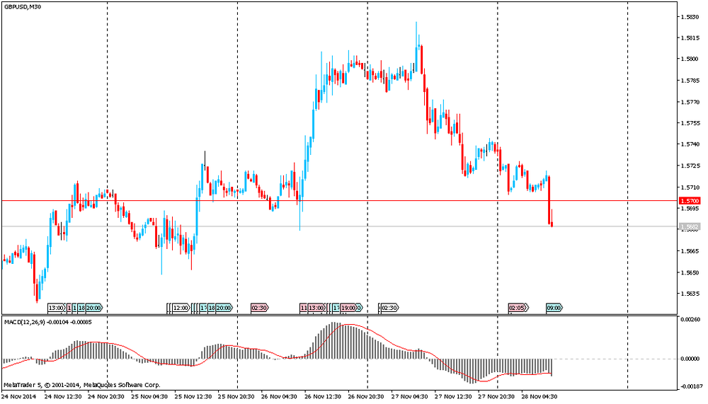 Фунт подешевел против американской валюты, оказавшись под давлением данных по индексу цен на жилье от Nationwide в Великобритании. Средняя стоимость дома в Великобритании в ноябре 2014 года повысилась по сравнению с октябрем на 0,3% и достигла 189,388 тыс. фунтов стерлингов. Об этом свидетельствуют данные крупнейшего ипотечного общества страны Nationwide Building Society. Рост цен замедлился после повышения на 0,5% в октябре. При этом в сентябре наблюдалось снижение цен после 16 месяцев роста. В годовом исчислении рост цен на жилье замедлился до 8,5% после 9% в октябре. Напомним, экономика Великобритании в III квартале увеличилась на 0,7% в квартальном выражении. Таким образом, темпы экономического подъема замедлились по сравнению со II кварталом, когда рост составил 0,9%. Рост ВВП относительно аналогичного периода 2013 года замедлился до 3% с 3,2% в апреле-июне.