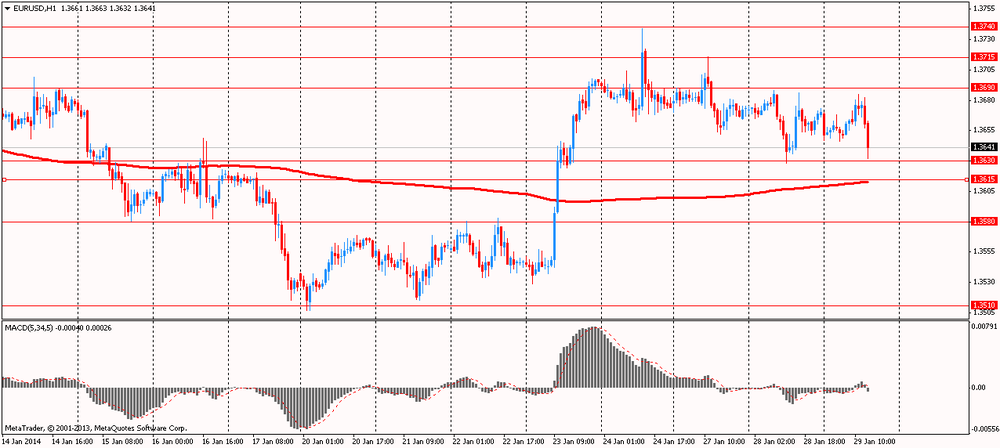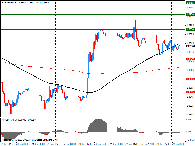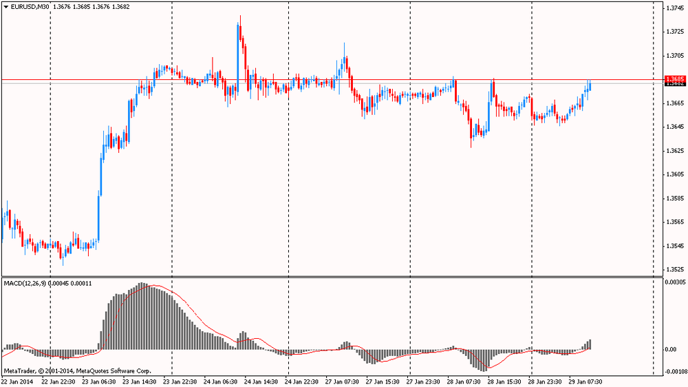 Курс евро восстановил почти все ранее утраченные позиции против доллара, вернувшись при этом до уровней открытия сессии на фоне отсутствия экономических драйверов и в ожидании решения ФРС. Отметим, что сегодня завершается первое в текущем году заседание Комитета по открытому рынку (FOMC) ФРС. Данное заседание будет последним для Бена Бернанке в качестве председателя. Но, не поэтому данное заседание является важным. Факт изменения руководства федрерва не является существенным для рынков, поскольку это уже учтено в ценах, а имя следующего главы американского центробанка уже давно известно. Более важным является ответ на вопрос продолжит ли федрезерв сворачивать программу количественного смягчения (QE)? Скорее всего, ответ на данный вопрос будет утвердительным. Но, есть ряд факторов, которые снижают вероятность подобного исхода и не исключают того, что федрезерв займет выжидательную позицию, не внеся в свою денежно-кредитную политику никаких изменений. Многие эксперты говорят, что центральный банк, вероятно, сократит свои ежемесячные покупки облигаций на 10 млрд. долл., с последующими дополнительными изменениями на ту же сумму в течение следующих пяти встреч, и уже до конца года объявит о завершении данной программы.
