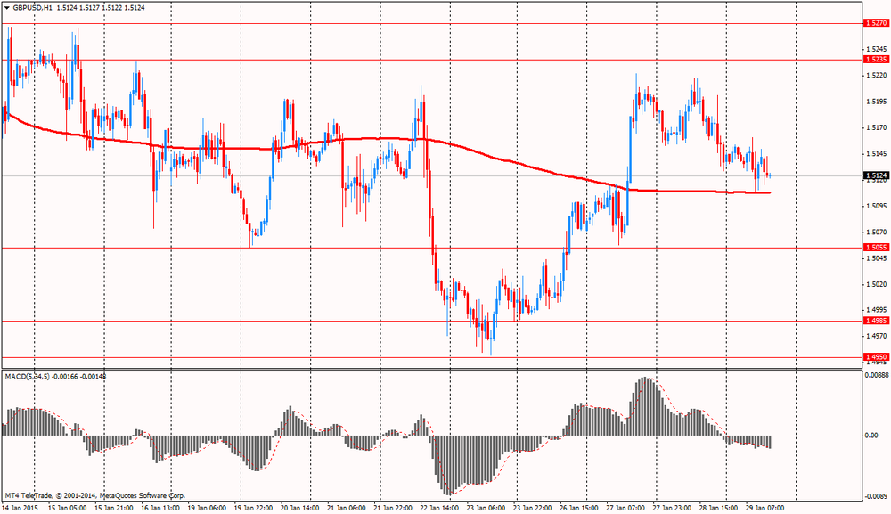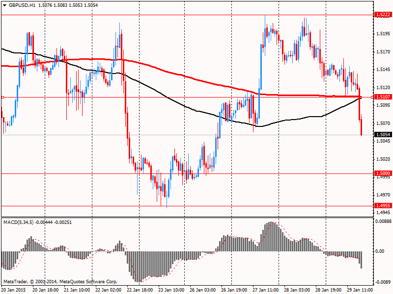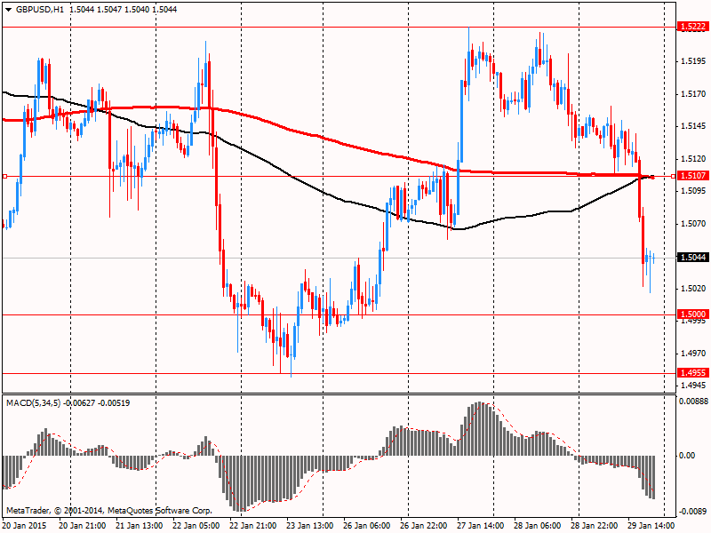 Фунт существенно подешевел против доллара США, потеряв при этом более 100 пунктов и приблизившись к отметке $1.5000. На ход торгов повлияли оптимистичные данные по рынку труда США. Как сообщалось ранее, первичные обращения за пособием по безработице сократились на 43 000 и с учетом сезонных колебаний достигли 265 000 на неделе, завершившейся 24 января. Это был самый низкий уровень с апреля 2000 года. Экономисты ожидали 300 000 новых требований. Падение может быть связано с укороченной рабочей неделей в связи с праздником Мартина Лютера Кинга, сказал аналитик Министерства труда. Данные за предыдущую неделю были пересмотрены до 308000 с 307000. Скользящая средняя за 4-е недели для первоначальных заявок, которая выравнивает еженедельную волатильность, снизилась на 8250 до 298 500. Количество людей, продолжающих получать пособия по безработице, снизилось на 71 000 до 2,4 млн за неделю, завершившуюся 17 января. Последние данные добавили уверенности по поводу восстановления экономики и повысили ожидания того, что ФРС начнет поднимать ставки раньше, нежели прогнозировалось ранее.