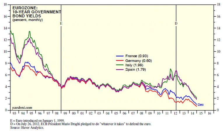 Эд Ярдени является президентом президентом и главным инвестиционным стратегом Yardeni Research, Inc. В своей статьей он пишет, что после введения евро в начале 1999 года доходность облигаций среди стран еврозоны почти не отличилась, так как инвесторы больше не видели кредитного риска для различных членов валютного союза. Спред доходности между испанскими и итальянскими государственными облигациями по сравнению с аналогичными немецкими бумагами сократился до нуля в течение предыдущего десятилетия. В начале текущего десятилетия спреды снова начали расширяться, но после того, как 26 июля 2012 года глава ЕЦБ Марио Драги пообещал сделать все возможное для защиты евро, было зафиксировано значительное сокращение спреда.