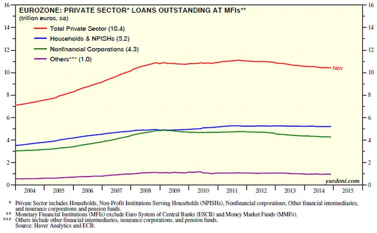 Данные, представленные ЕЦБ, показали, что кредиты для частного сектора еврозоны выросли на €4,0 трлн - до рекордных €11,1 трлн евро от начала 2004 до конца 2011 года. По состоянию на ноябрь 2014 года этот показатель опустился до €10,4 трлн. Другими словами, различные попытки ЕЦБ возродить кредитование после финансового кризиса потерпели неудачу. Это может быть связано с тем, что заемщики уже превысили свою способность обслуживать растущий объем долга.
