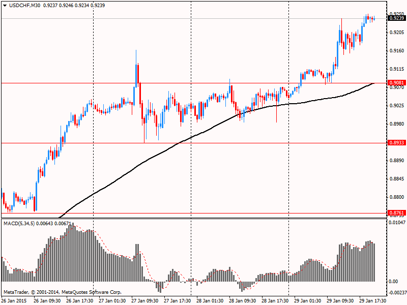 Американский доллар вырос против швейцарского франка, закрепившись при этом выше уровня CHF0.9200. Повышение было связано с ожиданиями, что Швейцарский национальный банк может вмешаться в валютный рынок для предотвращения чрезмерного роста курса валюты. В недавнем интервью вице-президент ШНБ Жан-Пьер Дантин сообщил, что банк до сих пор «основательно готов» вмешиваться в работу валютных рынков. Напомним, 15 января центральный банк Швейцарии отказался от курсового лимита последних трех лет 1,20 за евро. Кроме того, банк снизил ставку до -0,75% с -0,25%. Решение было принято под давлением на швейцарский франк прогнозов количественного смягчения со стороны Европейского центрального банка, который вынужден прибегнуть к нему в борьбе с угрозой дефляции в еврозоне.