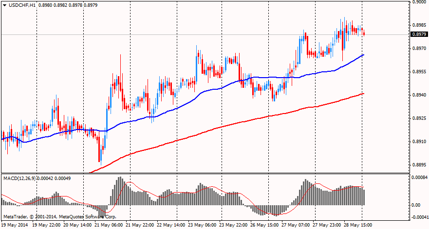 Курс швейцарского франка незначительно снизился против доллара, что было связано с выходом отчета по Швейцарии. Согласно опубликованным сегодня данным Государственного секретариата по экономическим вопросам, рост экономики Швейцарии в 1-м квартале ускорился на 0,5% по сравнению с предыдущим кварталом, и на 2,0% по сравнению с таким же периодом прошлого года. Эти результаты почти совпали с прогнозами экономистов, которые ожидали роста на 0,5% по сравнению с 4-м кварталом, и на 2,1% - по сравнению с 1-м кварталом прошлого года. Позитивный вклад в рост ВВП в основном внес баланс внешней торговли товарами и услугами, а также инвестиции в строительство. В настоящее время секретариат прогнозирует рост ВВП Швейцарии на 2,2% в этом году и на 2,7% в 2015 году. Обновленные прогнозы секретариата по ВВП, инфляции и безработице выйдут 17 июня. Швейцарский национальный банк ожидает, что экономика страны в этом году вырастет на 2%.