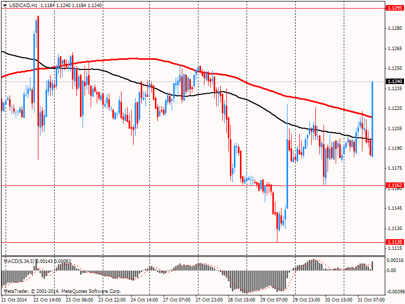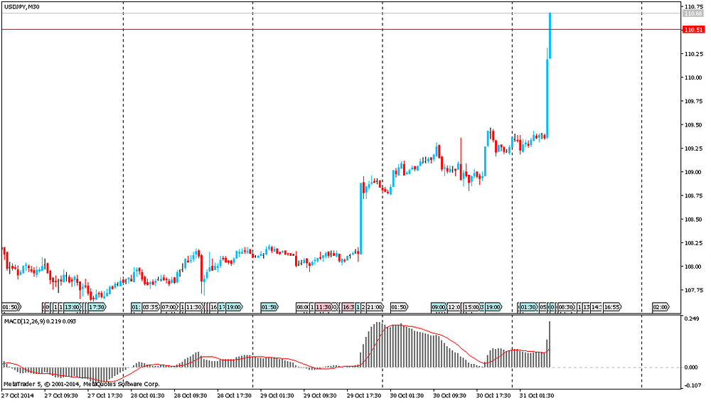 Доллар вырос против иены, обновив трехнедельный максимум. На ход торгов продолжало влиять вчерашнее решение ФРС. Напомним, Федеральная резервная система объявила об окончании программы покупок облигаций на фоне улучшения ситуации на рынке труда. ФРС предоставила довольно оптимистичную оценку перспектив рынка труда и экономики США. Помимо этого, Федеральный резерв заявил, что краткосрочные процентные ставки будут оставаться около нуля в течение "значительного периода времени". Однако инвесторы теперь с большим оптимизмом ждут повышения ставок. Согласно анализу, проведенному на фьючерсных площадках, на данный момент существует 75% вероятность сохранения сверхнизких ставок ФРС до октября 2015 года против 69% на прошлой неделе.