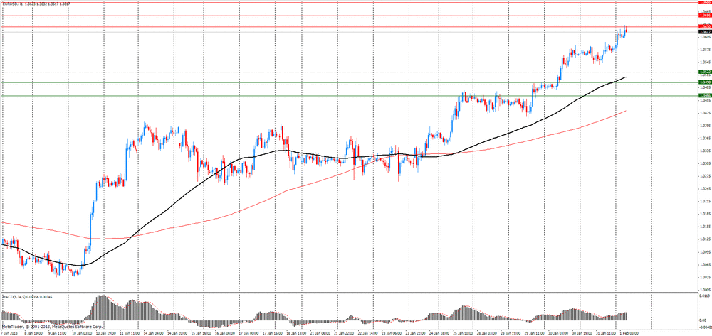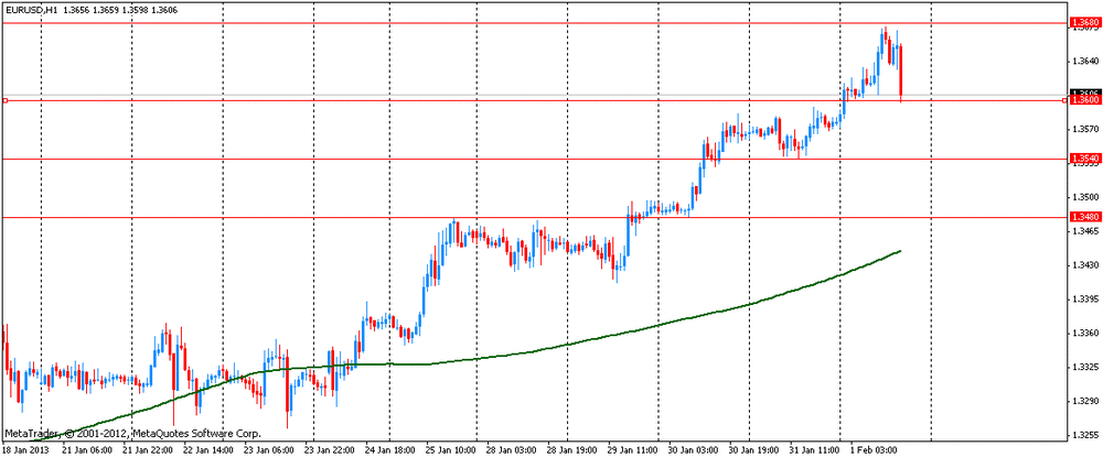 Пара коснулась минимума среды на $1.3585 после отчета NFP США, но далее восстановилась на ISM в сфере обрабатывающей промышленности, который вырос в январе до уровня 53,1 с 50,7. Индекс выплаченных цен ISM вырос от 55,5 до 56,5 против прогноза в 56,0. Между тем, потребительские настроения в США выросли от 72,9 до 73,8 в январе, превысив пессимистичный прогноз в 71,5.