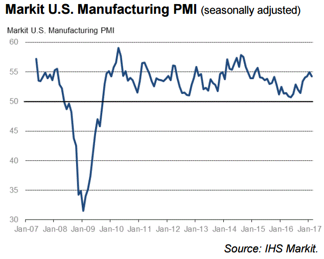 Окончательные данные, представленные Markit Economics, показали: с учетом сезонных колебаний производственный индекс PMI снизился в феврале до 54,2 пункта с 55,0 пункта в январе. Последнее значение оказалось ниже предварительной оценки (54,3 пункта) и прогнозов экспертов (54,4 пункта). В отчете сообщалось, что производственная активность в США продолжала расширяться высокими темпами, хотя последний подъем был немного слабее, чем отмечалось в начале 2017 года. Это в значительной степени отражало умеренность в росте новых заказов после достижения 28-месячного пика в январе, наряду с несколько более слабым увеличением объемов производства. Производители сообщили об устойчивом росте уровня товарных запасов, что было связано с большими производственными графиками и ожидаемым улучшением спроса со стороны клиентов.