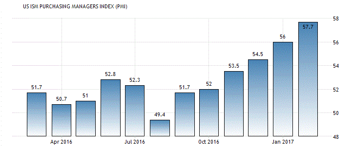 Вместе с тем, отчет, опубликованный Институтом управления поставками (ISM), показал, что в январе активность в производственном секторе США заметно выросла, достигнув самого высокого уровня с ноября 2014 года. Индекс PMI для производственной сферы составил 57,7 пункта против 56,0 пункта в январе. Аналитики ожидали, что данный показатель останется без изменений. Напомним, показатель является результатом опроса около 400 фирм из 60 секторов по всем США, включая сельское хозяйство, добычу, строительство, транспортную сферу, связь, оптовые и розничные компании.