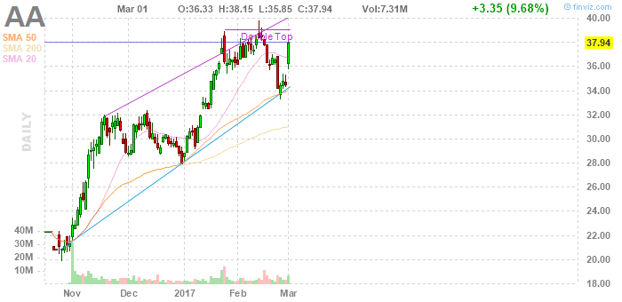 На текущий момент акции Alcoa (АА) котируются по $37,94 (+9,68%)