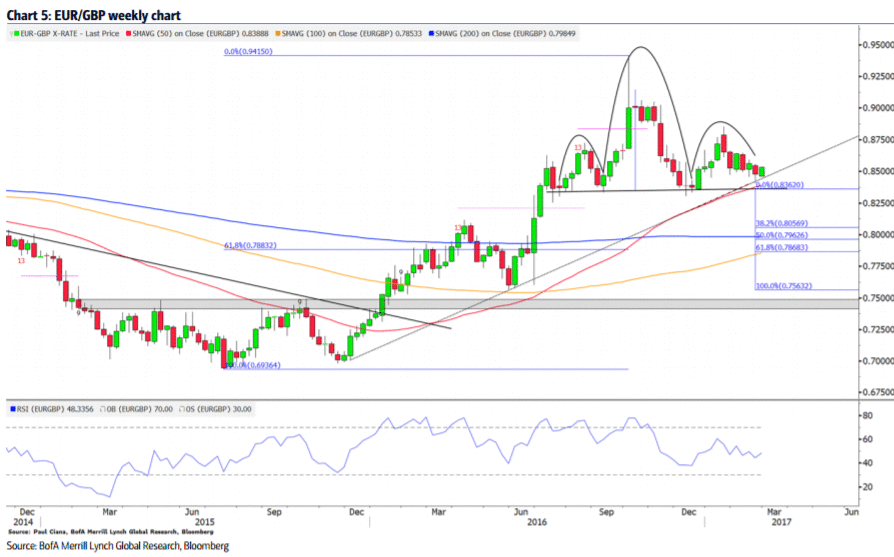 "Пара EUR/GBP: На графике видно, что почти полностью проявилась фигура "голова и плечи". Сейчас осталось только сформировать правое плечо. Значительная поддержка, которую необходимо преодолеть, чтобы подтвердить вершину, включает в себя ближайшую линию тренда, 50-недельную SMA и линию шеи от 0.84600-0.83600. Закрытие ниже подтвердит образование фигуры и создаст условия для снижения пары к целям на уровне 0,79600 и 0.78700. Важное сопротивление расположено на 0,86400 и 0,88500.