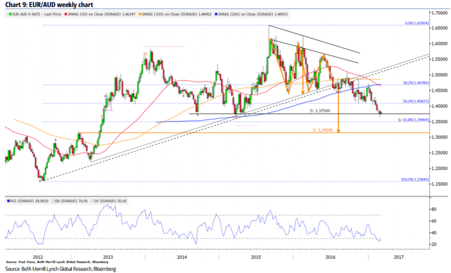 Пара EUR/AUD: Широкий треугольник сверху, пробой основных линий тренда и медвежье пересечение скользящих средних - все эти факторы говорят в пользу падения пары EUR/AUD. Целью в данном случае окажется уровень 1.34500. Курс пары упал до двухлетних минимумов, до близлежащей поддержки на 1.37500. Мы ожидаем, что произойдет некоторое восстановление, но при этому мы считаем, что продажи пары должны возобновится, особенно если она достигнет области сопротивления 1.40- 1.41. Поддержка расположена на 1,37500, 1,34900, 1,34500, а сопротивление - на 1,40900 и 1,42700", - заявили эксперты.