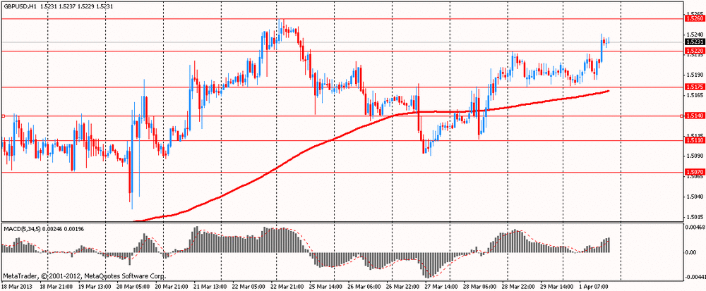 Сопротивление отмечено на $1.5260 (максимум 25 марта) и $1.5320 (максимум 22 февраля). Поддержка находится на $1.5175 (область минимумов дня и 29 марта) и $1.5140 (минимум 22 марта).
