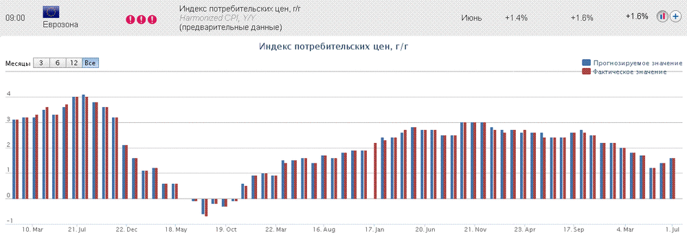 09:00 Еврозона Индекс потребительских цен, г/г Июнь +1.4% +1.6%