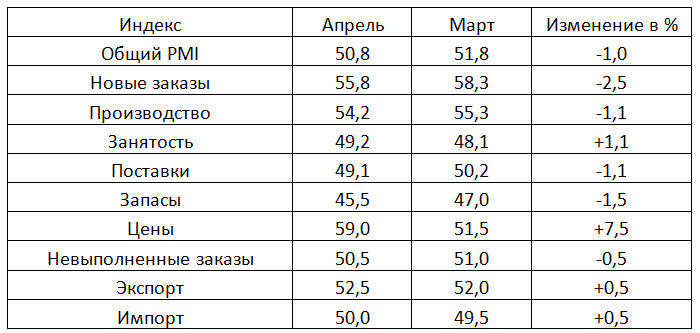 Рост показателя наблюдается 10 месяцев подряд. Однако в этом месяце по сравнению с прошлым месяцем, есть небольшое снижение, проявляющееся в некоторых деталях. Например: Новые заказы снизились до 52,1 в этом месяце; Занятость сократилась на 4,3 пункта с марта снизившись до 49,0 в апреле