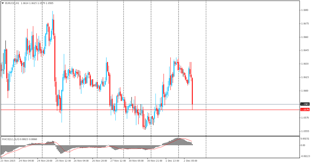 Доллар США заметно подешевел против евро, достигнув минимума 27 ноября. Давление на валюту оказали слабые данные по деловой активности в производственном секторе США. Отчет от ISM показал, что активность в производственной сфере в ноябре сократилась впервые с конца 2012 года под давлением со стороны слабости мировой экономики и укрепления доллара США. Согласно данным, индекс PMI для производственной сферы в ноябре упал до 48,6 с 50,1 в октябре. Экономисты ожидали роста индекса до 50,4. Также в отчете сообщалось, что индекс запасов в ноябре упал до 43,0 против 46,5 в октябре, индекс производства снизился до 49,2 с 52,9, индекс новых заказов опустился до 48,9 с 52,9, индекс занятости вырос до 51,3 с 47,6, а индекс цен упал до 35,5 с 39,0. Хотя данные оказали хуже прогнозов, они не уменьшили ожидания относительно повышения ставок ФРС в декабре. Согласно фьючерсам на ставку по федеральным фондам, вероятность ужесточения политики ФРС на заседании 15-16 декабря составляет 79%.