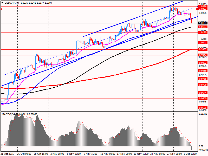 Стоит подчеркнуть, такое резкое снижение пары отмечается в первые с середины октября, что может указывать на среднесрочную коррекцию или на изменение тренда на нисходящий. В пользу этого говорят такие факторы: пара закрепилась ниже линии поддержки восходящего канала, индикатор MACD на четырехчасовом графике переместился на отрицательную территорию (впервые с 21 октября). Также добавим, на часовом графике пара опустилась ниже МА(200) для Н1, что также произошло в первый раз с 21 октября. В случае дальнейшего снижения важной поддержкой будет выступать уровень CHF1.0163 (МА(100) для Н4)