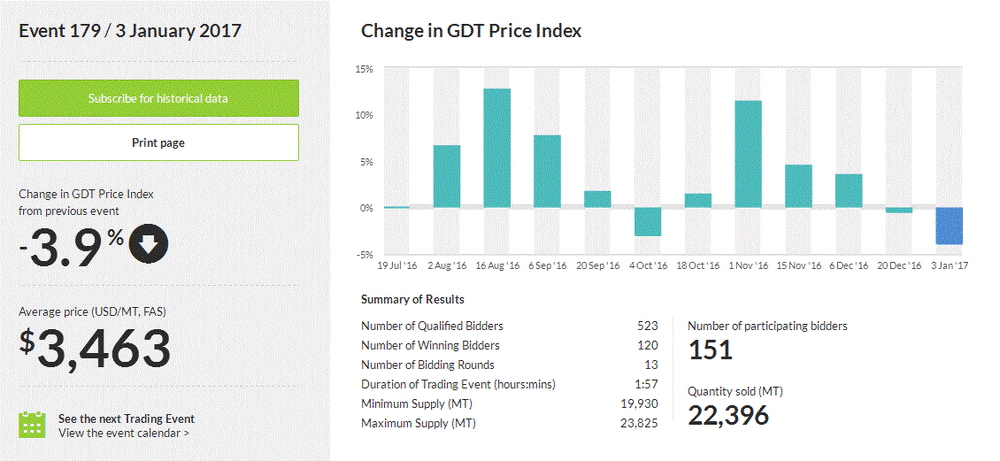 Как стало известно, стоимость молочной продукции снизилась на 3,9% (до $3463 за метрическую тонну) после того, как уменьшилась на 0,5% в ходе предыдущего аукциона. Стоит подчеркнуть, падение цен было зафиксировано во второй раз подряд. Результаты аукциона также показали, что стоимость цельного сухого молока обвалилась на 7,7%, до $3294 за метрическую тонну.