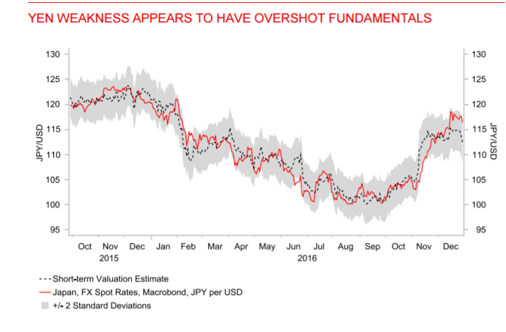 "Мы всегда находим полезным обновление наших краткосрочных моделей оценки, если стоимость каких-либо валют G10 существенно расходится с традиционными краткосрочными фундаментальными драйверами. Одно из самых больших расхождениях сейчас прослеживается между спот-курсом пары USD/JPY и нашей краткосрочной моделью оценки, которая сигнализирует, что пара должна торговаться между уровнями Y110.00 и Y115.00. Спот-курс в настоящее время находится выше примерно на уровне около двух стандартных отклонений нашей модели оценки. Текущий курс спрос очень "растянут" и сигнализирует о значительном риске падения пары USD/JPY в краткосрочной перспективе. Слабость иены, похоже, превосходила краткосрочные фундаментальные показатели в течение декабря. Скорее всего, потребуется свежий фундаментальный катализатор, чтобы оправдать продолжение недавнего восходящего импульса пары USD/JPY в сторону уровня Y120,00. Все внимание будет приковано к инаугурации избранного президента Трампа, которая запланирована на 20 января. Что касается евро, масштабы недавнего падения в большей степени соответствуют краткосрочным фундаментальным драйверами. Наша модель оценки сигнализирует, что риски для евро по-прежнему смещены в сторону снижения в ближайшей перспективе", - заявили эксперты.