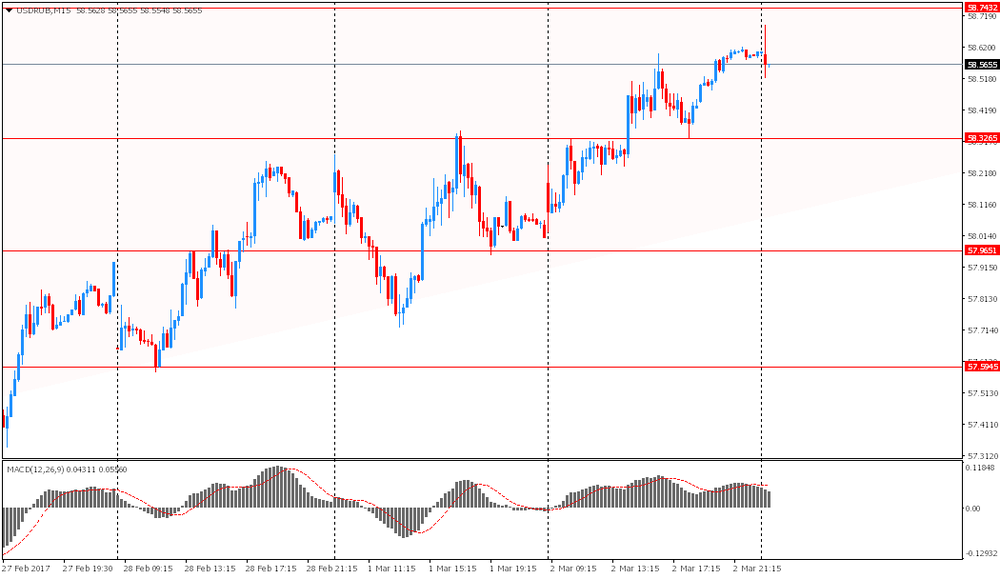 Российские индексы росли вслед за котировками нефти. Так, стоимость фьючерса на нефть марки Brent в ходе торгов на бирже ICE в Лондоне с поставкой в мае 2017 г. сегодня увеличилась на 1,03% - до $55,65 за баррель. Вслед за нефтью курс доллара снизился к рублю на 0,65%, до 58,43 руб., евро - на 0,21%, до 61,67 руб.
