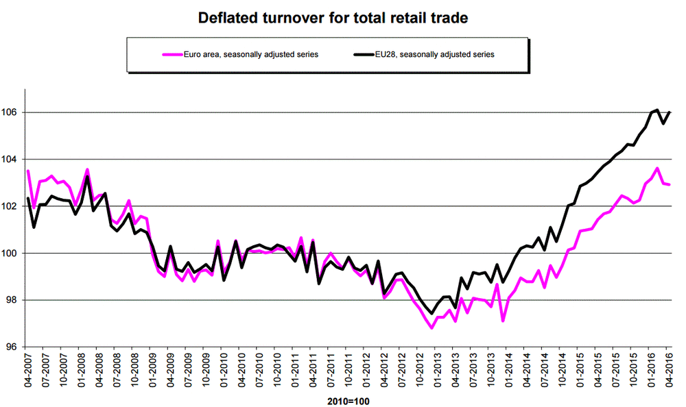 Прогноз роста ВВП еврозоны в 2016 году повышен до 1,6% с ожидавшихся ранее 1,4%. В 2017 году экономика еврозоны увеличится на 1,7%, в 2018 году - также на 1,7%, прогнозирует ЕЦБ. Таким образом, ЕЦБ сохранил прогноз роста ВВП в 2017 году на прежнем уровне и понизил прогноз на 2018 год с 1,8%.